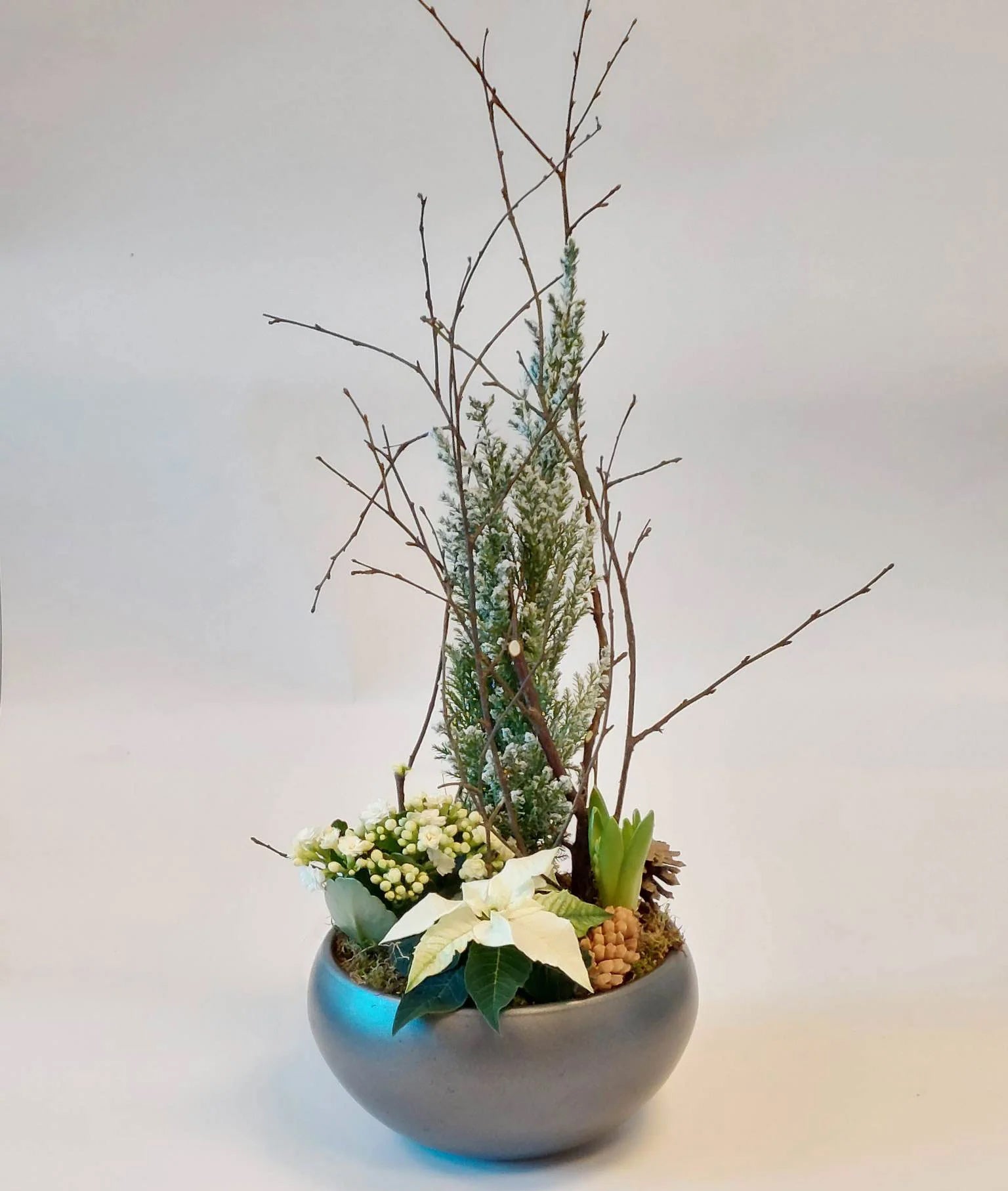 Svibel, julestjerne og ildtopp dekorert med kongler, kvister mose og pynt - kan variere litt fra bilde - men vi lager tilnærmet lik bilde.